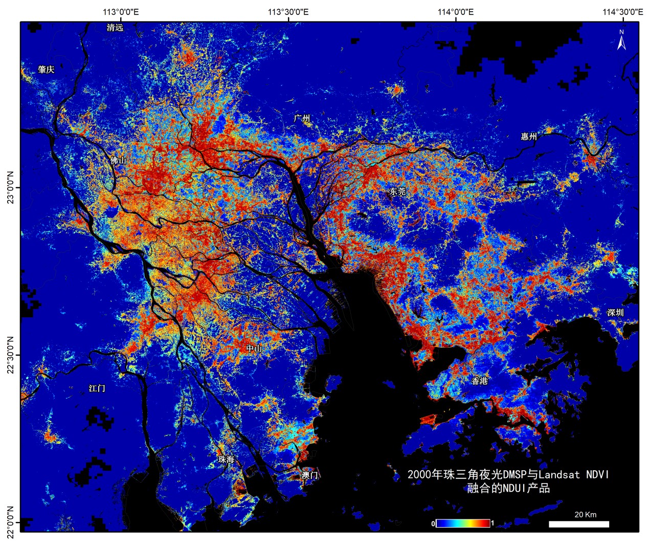 归一化城市指数(NDUI)由张清凌教授团队联合谷歌GEE团队以及美国中密歇根大学李斌教授于2015年提出,通过融合Landsat7影像和DMSP夜光影像得到。该遥感融合产品既能清晰明确地将城市从周边环境中凸显出来,又能够精细地分辨出城市内部结构,提供街道级的空间细节信息,在全球减灾防灾救灾、贫困消除、可持续发展以及城市研究等方面都有巨大的应用潜力。NDUI算法已经被NASA采用,融合VIIRS/DNB夜光产品与Landsat数据生产高分辨率的Black Marble产品。