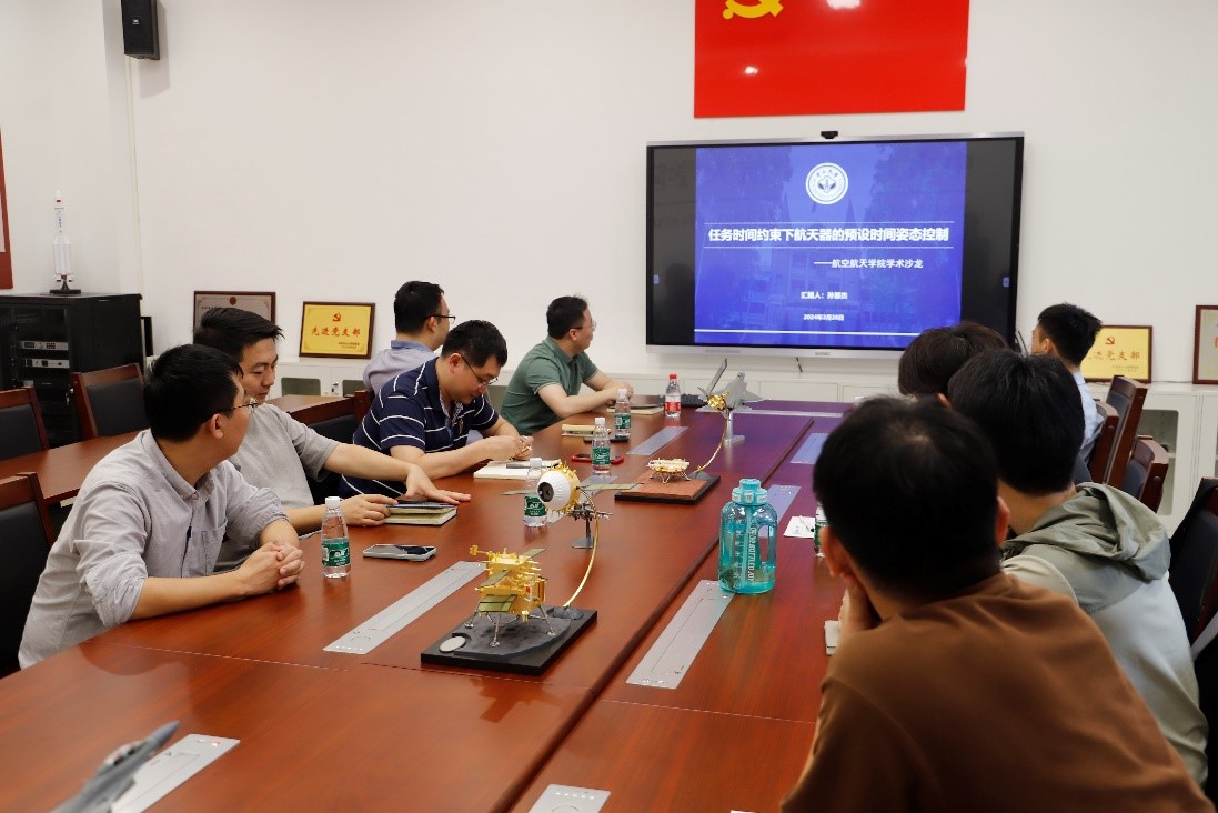孙慧杰副教授首先分享了关于其在“任务时间约束下航天器的预设时间姿态控制”方面的工作内容,,他向与会师生详细介绍了其团队在任务时间约束下航天器的预设时间姿态控制方面的创新研究,重点分析了外部环境干扰如太阳风力矩、重力梯度力矩、磁力矩,以及内部因素比如负载移动、燃料消耗导致的质量特性变化等对航天器有限时间预设姿态跟踪控制的具体影响。此外,他还探讨了姿态跟踪控制系统的稳定性、准确性和响应速度对完成任务目标的关键性作用。