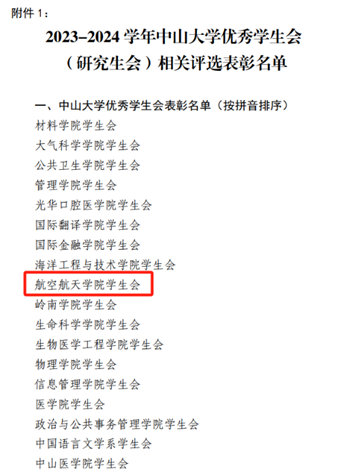 近期,一年一度的优秀学生会评选展示活动落下帷幕。在过去的一学年里,航空航天学生会全体成员秉持着“全心全意为同学服务”的宗旨,积极履行职责,组织开展内容丰富、形式多样的学生活动,营造和谐、积极的校园氛围。。在大家的共同努力下,44118太阳成城学生会获评“2023-2024学年中山大学优秀学生会”的荣誉称号,钟轩老师获评“中山大学优秀学生会指导老师”荣誉称号,刘熙之、刘雨扬、朱烨同学获评“中山大学优秀学生会骨干”荣誉称号。