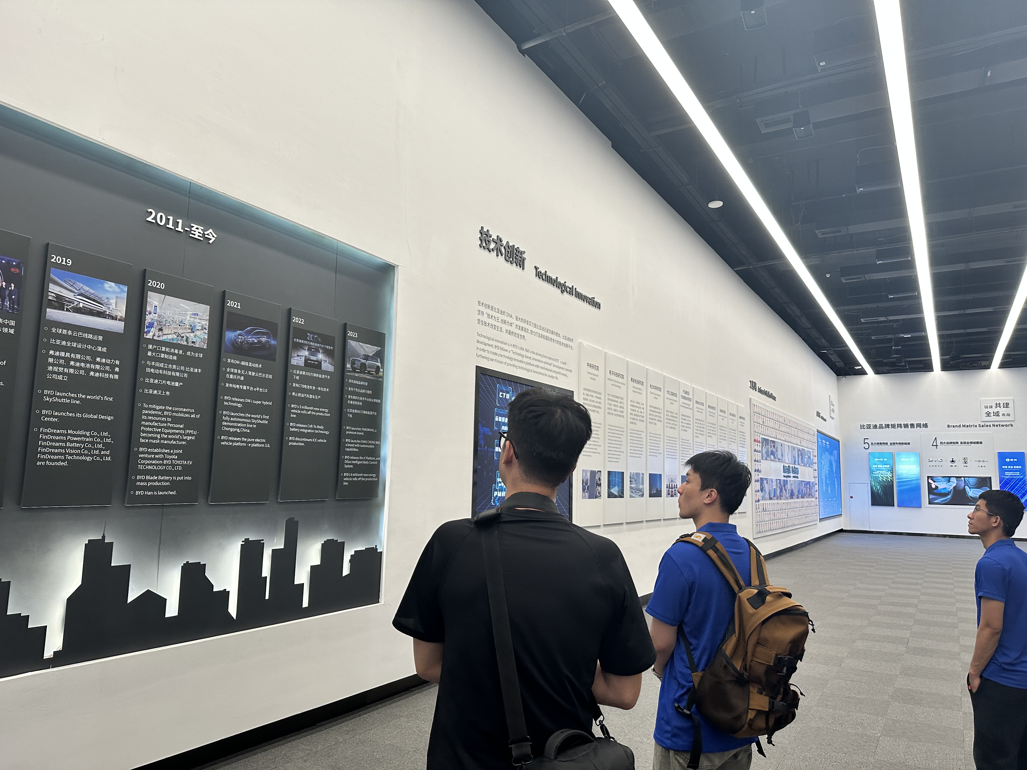 全体师生在讲解员的带领下参观了比亚迪礼宾楼一楼展厅,了解企业的发展历程、发展理念以及业务布局。时至2024年3月,比亚迪第700万辆新能源汽车正式下线,成为全球首家新能源汽车产量到达700万台的整车企业。