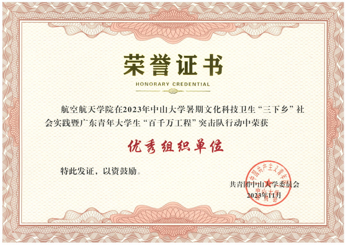 学院指导的中山大学无人飞行器协会征战2023中国大学生飞行器设计创新大赛,取得了2项一等奖,4项二等奖,2项三等奖(国家级)的优异成绩;我院学生社团学生微纳卫星协会成员,在2023年世界大学生立方星挑战赛中国区总决赛中再获多项大奖,双双获评2023年中山大学优秀学生社团。学院指导的中山大学力学结构协会在广东省大学生结构设计竞赛中获省级三等奖。