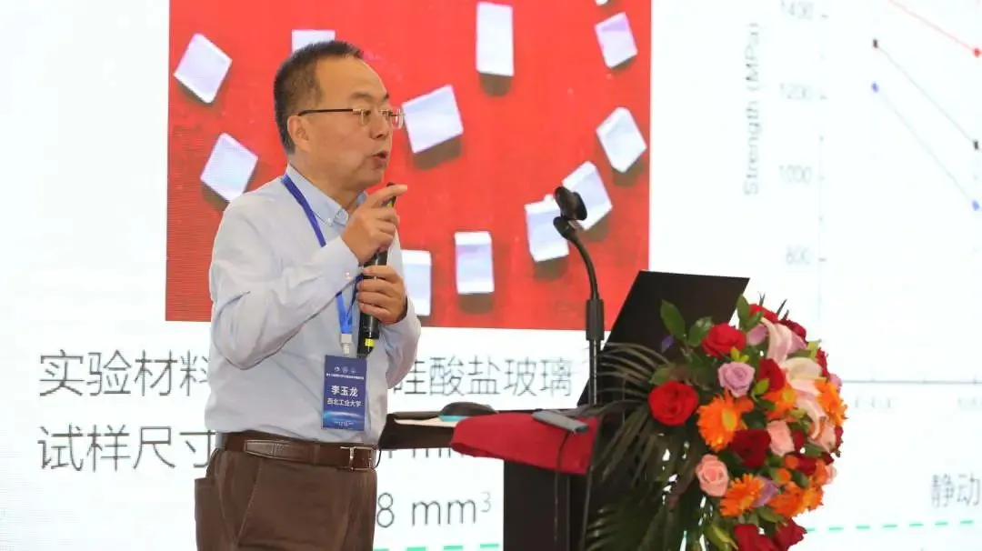 西北工业大学李玉龙教授的报告主题为《退火和化学钢化玻璃动态压缩拉伸和弯曲性能》。他分享了可以基于电磁感应原理产生应力波的ESHPB试验方法。相比于常规SHPB试验方法,该方法可以通过单轴双向同步加载更快实现应力平衡和恒应变率,有效解决了脆性玻璃材料难以进行高速动态试验的难点。李玉龙教授团队通过该方法对脆性玻璃材料的多项动态性能进行了表征,阐明了脆性玻璃材料动态加载下的应变率效应和尺寸效应,并分析了应力波加载方式对试样动态压缩强度的影响。