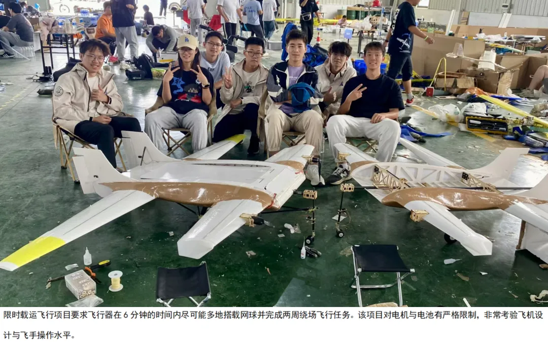 中山大学航模队本年参与了包括航天火箭发射与回收、限时载运飞行、固定翼无人机侦察与打击、微型固定翼限距飞行、太阳能飞机任务飞行和多旋翼无人机任务飞行共6个项目组的比赛。各项目组具体竞赛方式如下表所示。