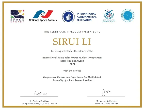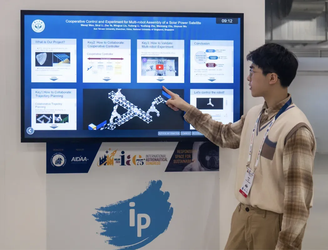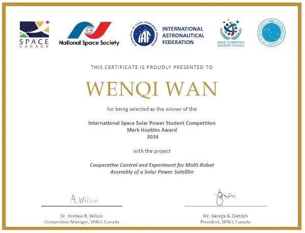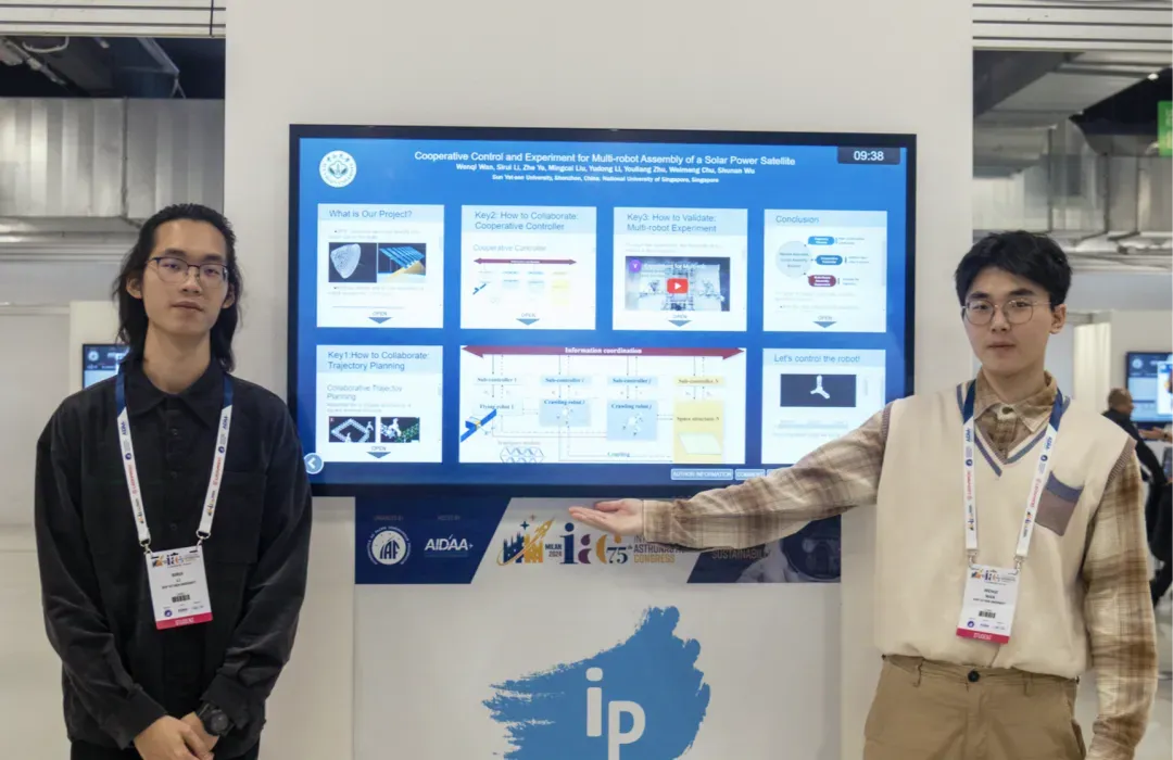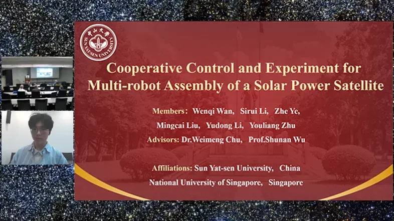 中山大学代表队由44118太阳成城研究生万文琦、叶哲、刘明财,本科生李思锐、李裕东、朱有亮等6名学生,以及邬树楠教授和初未萌博士2位指导教师组成,凭借作品《Cooperative Control and Experiment for Multi-robot Assembly of a Solar Power Satellite》及优异的现场表现,从初赛到决赛脱颖而出、斩获冠军。该作品提出了多机器人组装大型航天结构的协同控制方法并完成了地面原理性实验,相关成果可以应用于未来大型航天器在轨组装和维护。代表队曾于2023年获得由中国宇航学会举办的首届空间太阳能电站青年创新竞赛的全国冠军,经过2024年的不懈奋斗,代表队不断拓展前期的工作成果,披荆斩棘、再攀高峰,最终从全国冠军走向世界冠军!