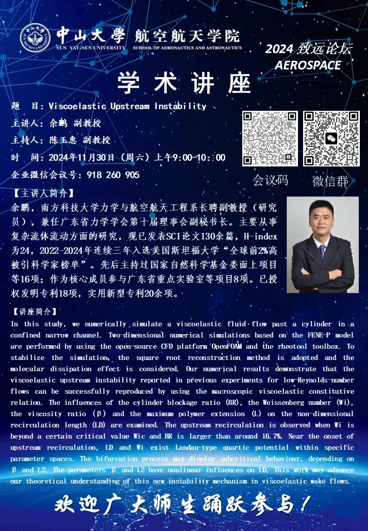 余教授讲述了通过数值模拟研究了粘弹性流体在狭窄通道中绕圆柱流动的情况。为稳定模拟采用了平方根重建方法并考虑了分子耗散效应。结果表明,低雷诺数流动中的粘弹性上游不稳定性可以通过宏观粘弹性本构关系成功复现。研究了圆柱堵塞比(BR)、魏森贝格数(Wi)、粘度比(β)和聚合物最大伸长(L)对回流长度(LD)的影响。发现当Wi超过临界值Wic且BR大于16.7%时,会出现上游回流。此研究有助于深入理解粘弹性尾流中的新型不稳定机制。