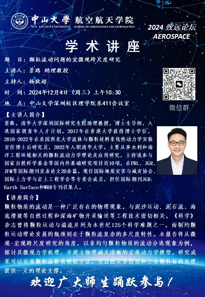 讲座介绍的颗粒物质的流动是一种广泛存在的物理现象,与泥沙运动、泥石流、海底滑坡等自然过程和深海矿物开采输送等工程技术密切相关。本报告从微观-宏观跨尺度研究的角度,以非均匀颗粒物质的流动分选现象为例,探讨其微观力学机理,并建立物理涵义清晰的宏观动力学模型。研究成果为进一步完善颗粒流数值模拟方法提供理论支持,可为自然灾害防治和工业颗粒材料处理提供一定的技术支撑。