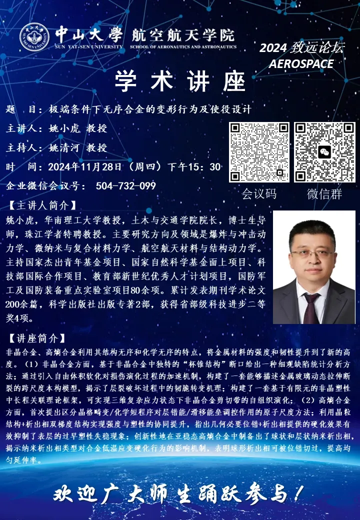 姚小虎教授分享了“极端条件下无序合金的变形行为及使役设计”的内容。