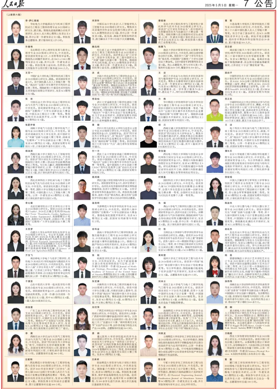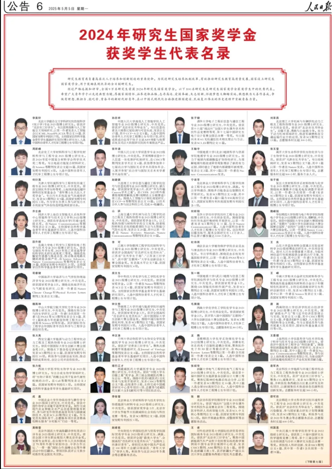 经过严格选拔和评审,全国9万名研究生荣获2024年研究生国家奖学金。以下100名研究生是研究生国家奖学金获奖学生中的优秀代表。希望广大青年学子以先进典型为镜,厚植家国情怀、涵养进取品格,志存高远、爱国奉献、矢志创新,怀抱梦想又脚踏实地,敢想敢为又善作善成,争做有理想、敢担当、能吃苦、肯奋斗的新时代好青年,在以中国式现代化全面推进强国建设、民族复兴伟业的历史进程中贡献青春力量。