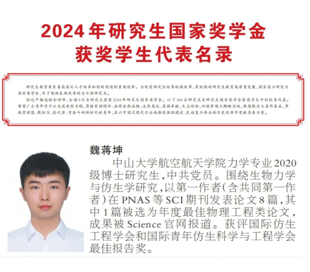 喜报 | 我院博士生魏蒋坤入选 2023-2024学年度国家奖学金学生代表名录