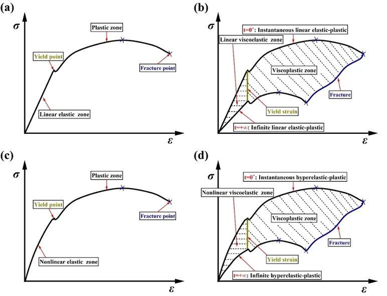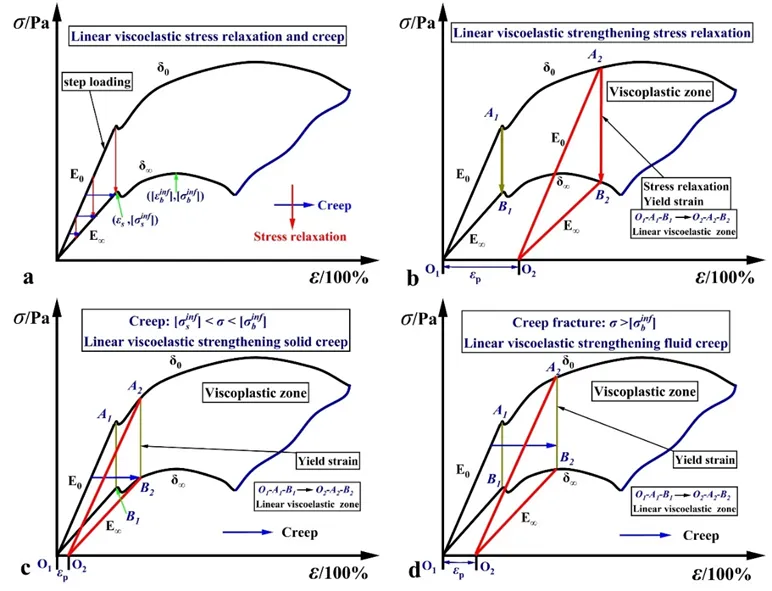 针对上述问题,研究团队提出强化叠加本构关系,揭示了粘弹性与粘塑性之间的强化机制。通过实验标定无穷线性弹塑性边界,团队将其作为衡量材料静态稳定性的物理判据,并重新定义了高温下金属的屈服强度与断裂强度。基于此,研究建立了三级蠕变稳定性判据:低应力状态下材料表现为粘弹性固体,应变随时间收敛并趋于稳定;中等应力引发粘弹性向粘塑性转变,虽出现塑性变形但仍可控;而高应力下材料则彻底转化为粘塑性流体,应变持续发散直至断裂。这一判据填补了传统理论只能定性描述蠕变稳定性问题。并首次描述了在粘塑性区域发生的应力松弛行为。