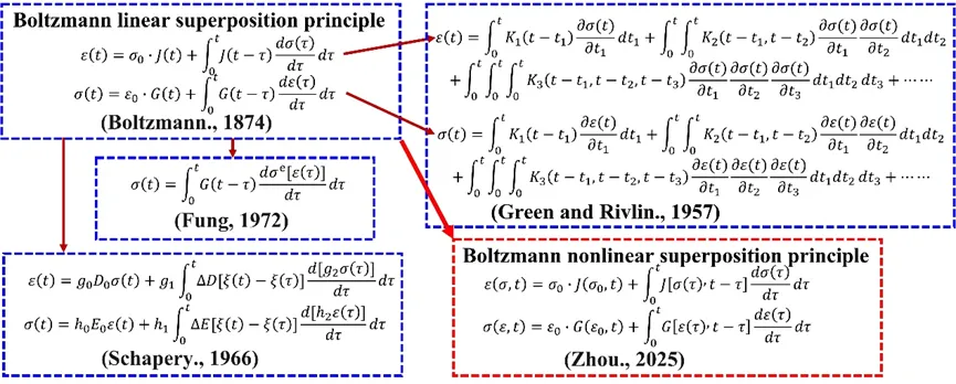 为进一步统一材料力学行为,团队构建了广义本构框架,整合胡克定律、麦克斯韦粘弹性流体模型、开尔文粘弹性固体模型等经典理论,形成覆盖从低温到高温全范围的材料行为预测体系。通过提出非线性粘弹性模型(如Maxwell-Mooney-Rivlin流体松弛模型与Kelvin-Mooney-Rivlin固体蠕变模型),研究实现聚合物材料的蠕变与应力松弛行为的统一表征,并突破传统线性叠加原理的局限,推导出Boltzmann非线性叠加方程组,为多级载荷下的复杂响应提供了解析工具。它是狭义静力学和广义静力学的桥梁方程组。