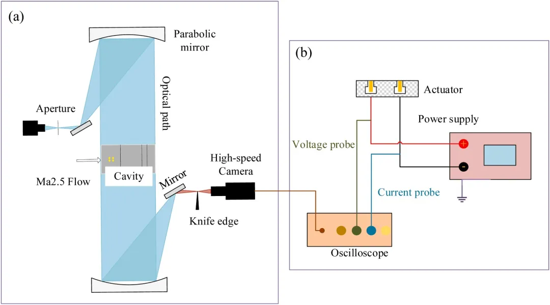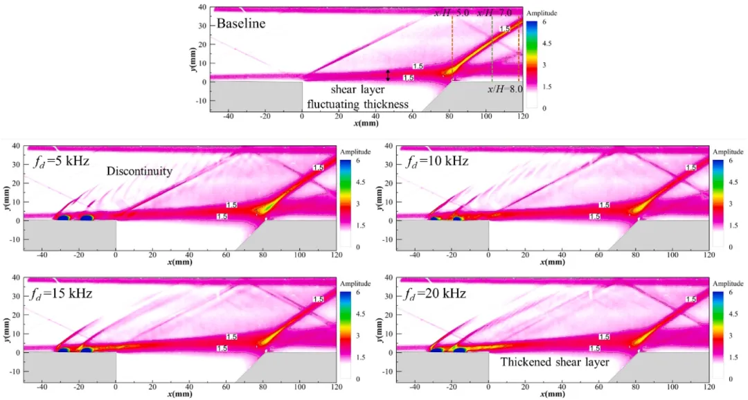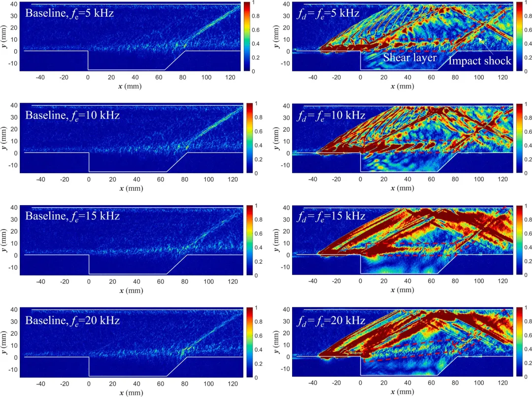 研究团队采用高频电弧等离子体激励器,在 5、10、15 和 20kHz 四种放电频率下开展实验,借助50kHz 采样频率的时间分辨纹影成像技术,对有无激励的凹腔流场进行诊断,并结合数据统计分析方法(Rms、POD、FFT)解析实验数据。