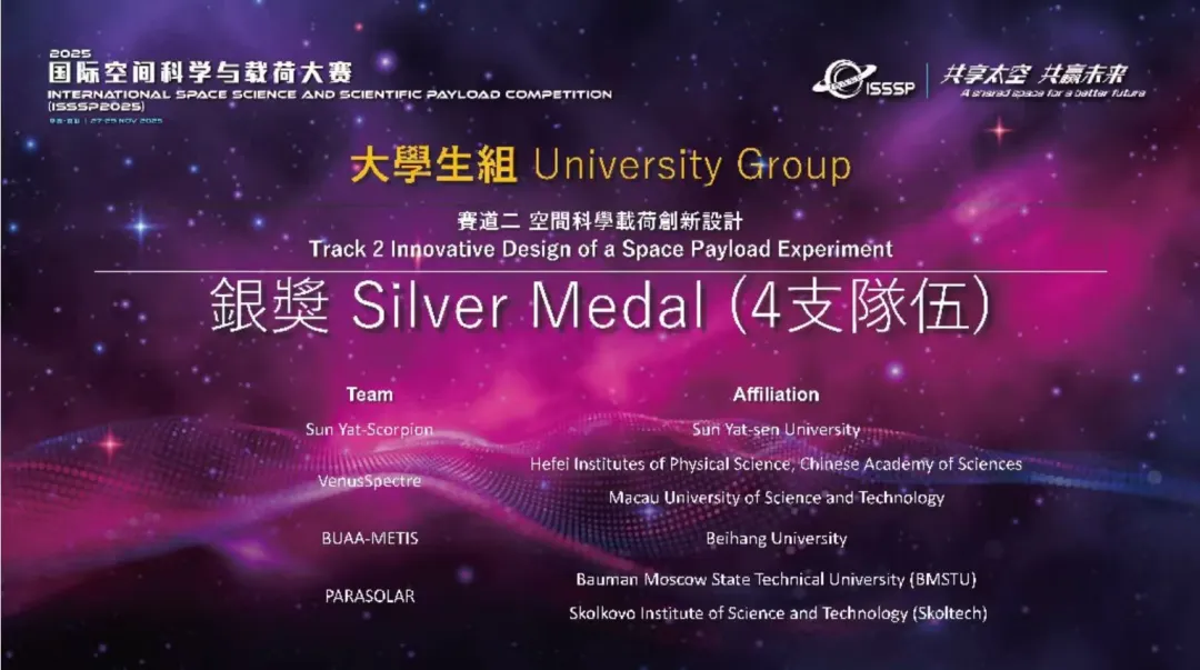 近日,2025年国际空间科学与载荷大赛在中国香港落下帷幕。44118太阳成城代表队凭借出色的表现,在“大学组赛道二:空间科学载荷创新设计”中荣获国际银奖(金奖空缺)。