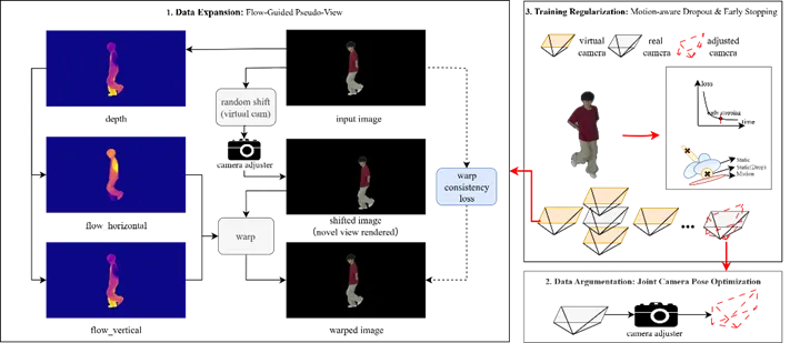 面对稀疏视图下3D高斯泼溅技术易出现的严重过拟合与浮动伪影难题,我院飞行器视觉感知团队(AVP)在航天员在轨运动分析技术研究的基础上,创新性地借鉴深度学习中的防过拟合思想,将问题类比为少样本学习场景,提出了以 “监督增强 + 训练正则”为核心的双支柱统一稀疏视图重建方法,有效提升了重建精度。