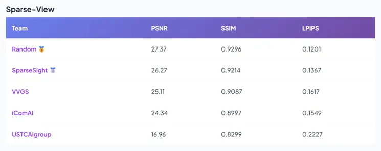 在官方评测中,团队【队名:Random;成员:叶乐佳(博士生),吴斌(硕士生),高静静(硕士生),巫毅扬(硕士生);指导老师:张小虎教授】的算法在峰值信噪比(PSNR)、结构相似性(SSIM)和学习式感知相似度(LPIPS)三项核心指标上均表现优异,显著领先于其他参赛队伍,最终以绝对优势斩获该赛道第一名。