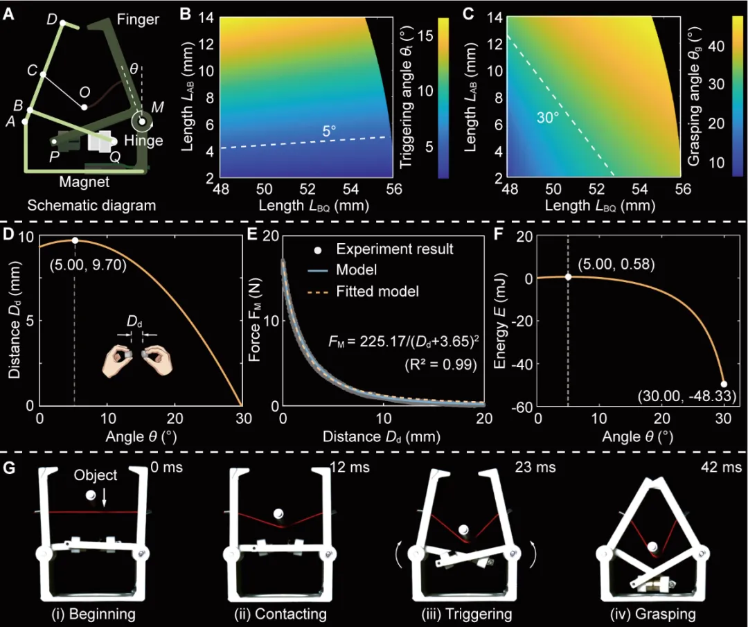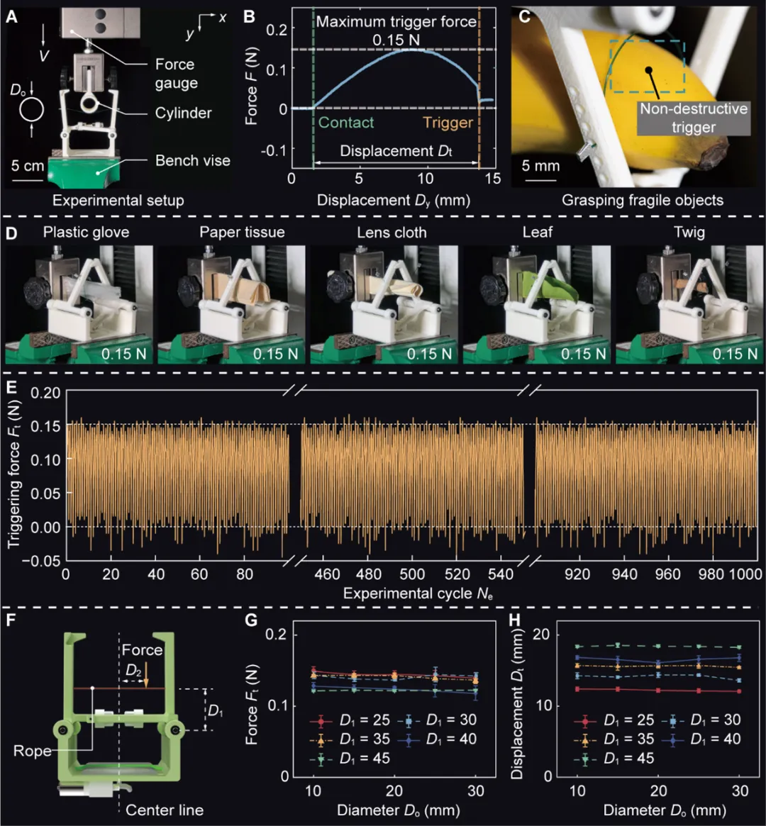 为揭示磁体参数与几何构型对系统能量壁垒的影响机制,研究人员建立了磁—结构耦合的力学模型,对双稳态系统在不同构型下的势能分布进行了定量分析。结果表明,磁体间距与排布方式可显著调控正向触发与反向解锁过程中的能量壁垒差异(图2)。在此基础上,结合实验手段,系统测试了物体尺寸、接触位置对抓取触发力的影响(图3),验证了该抓取器在极低触发力条件下的柔顺触发能力。此外还测试了触发的抗干扰性能,结果显示,触发需要的位移行程大概为18.40 mm,能够抵抗较大的抖动干扰。