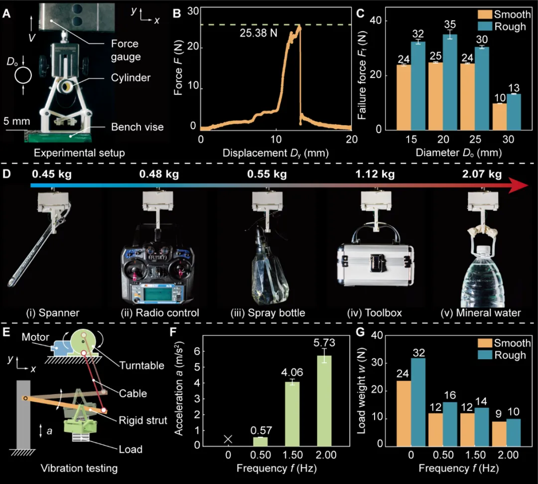 随后,研究进一步从理论与实验两方面分析了抓取保持阶段的稳定性。通过改变外加载荷与接触条件,对抓取失效力进行了系统测试(图4)。实验结果显示,该抓取器在保持阶段可形成显著高于触发阶段的能量壁垒,实现两个数量级以上的触发力—失效力比值,从而在无需持续供能的情况下保证可靠抓取。