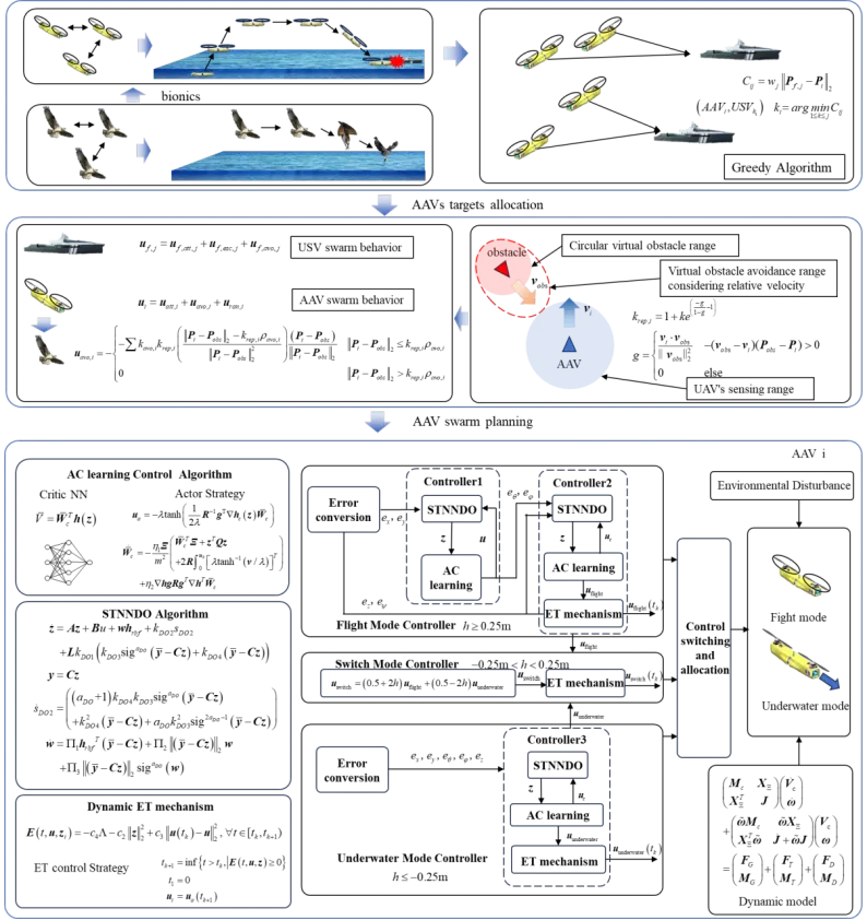 针对这一问题,中山大学张锦绣教授团队以“Osprey-fish gaming inspired planning and intelligent control of dual-rotor AAV swarm for cooperative hunting USV swarm”为题,在航空航天领域顶刊《Aerospace Science and Technology》(中科院一区,top, IF = 5.8)上发表论文。2024级博士生王立栋为第一作者,中山大学张锦绣教授、日本东北大学林名培助理教授为共同通讯作者。该论文中双旋翼跨介质无人机(潜鸟1号)曾获全国海洋航行器设计与制作大赛一等奖。此外,该研究得到了国家自然科学基金、广东省重点领域研发计划“海洋科技”重大专项旗舰项目、广东省特支项目以及南方海洋科学与工程广东省实验室(珠海)的资助。