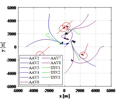 图4 DR-AAV集群对USV集群的围捕仿真
