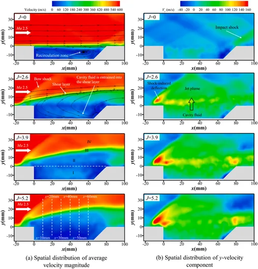 流动显示和测量结果发现,射流注入会显著抑制凹腔自由剪切层的形成,即产生射流-凹腔相互作用。不同强度弓形激波的反射激波与射流尾迹相交,诱导处激波-射流干扰,从而对射流的耗散造成影响。由速度场结果可以看出,喷注射流后,燃烧室内高y向速度的区域扩大,说明射流尾迹的反向旋转涡对(CVP)通过卷吸作用,实现来流、射流与凹腔流体的大规模交换,从而大幅提升混合效率。随着动量通量比增大,射流穿透深度提升,凹腔与射流的耦合作用更强,射流剪切层下方的速度分布更均匀,混合更充分。